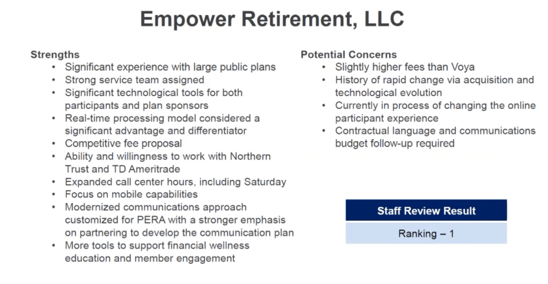 The PERA Board voted, pending final contract negotiations, to switch record keepers for the Defined Contribution plans (which includes the 401k/457b plans) from Voya to Empower. Voya came in second place in the RFP process, and it would've been "fine" to continue with them, but staff, the consultant, and the Board all thought Empower would … Continue reading PERA Votes to Switch from Voya to Empower