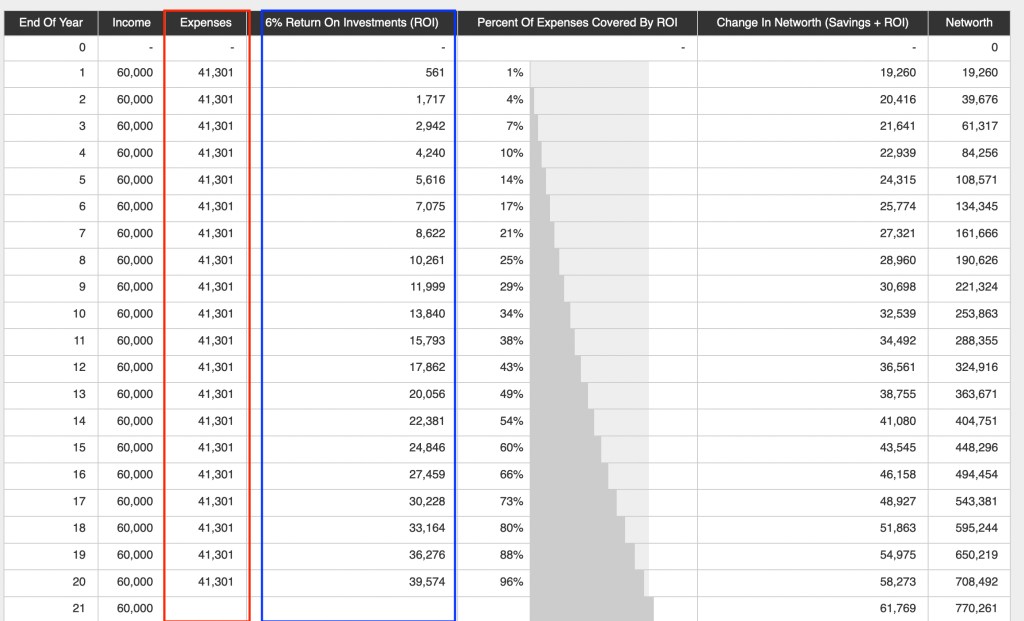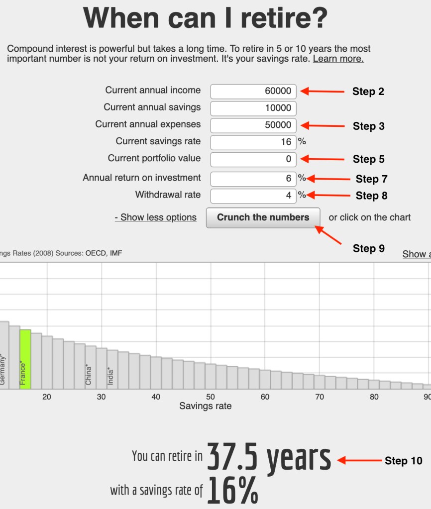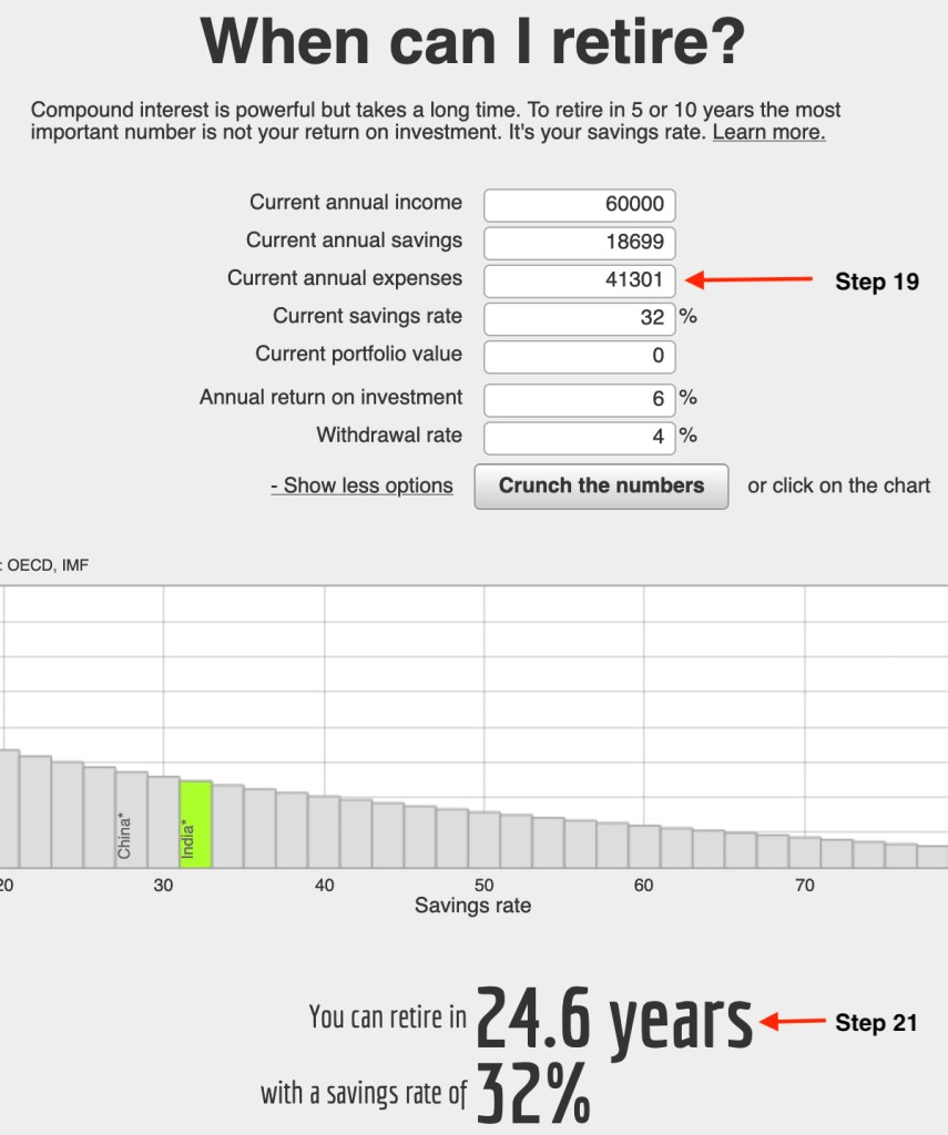 - Input your current income and expenses in both an online calculator and a spreadsheet. (You can also optionally enter a current balance in your investment accounts, an expected rate of return, and an expected safe withdrawal rate if you wish to customize even more.)