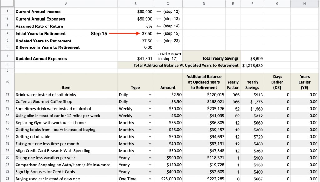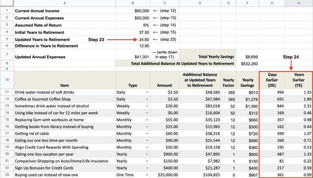 | 24 | For each item in the savings table, look at columns G (Days Earlier) and H (Years Earlier) to see how many days/years earlier each change can allow you to retire. |
