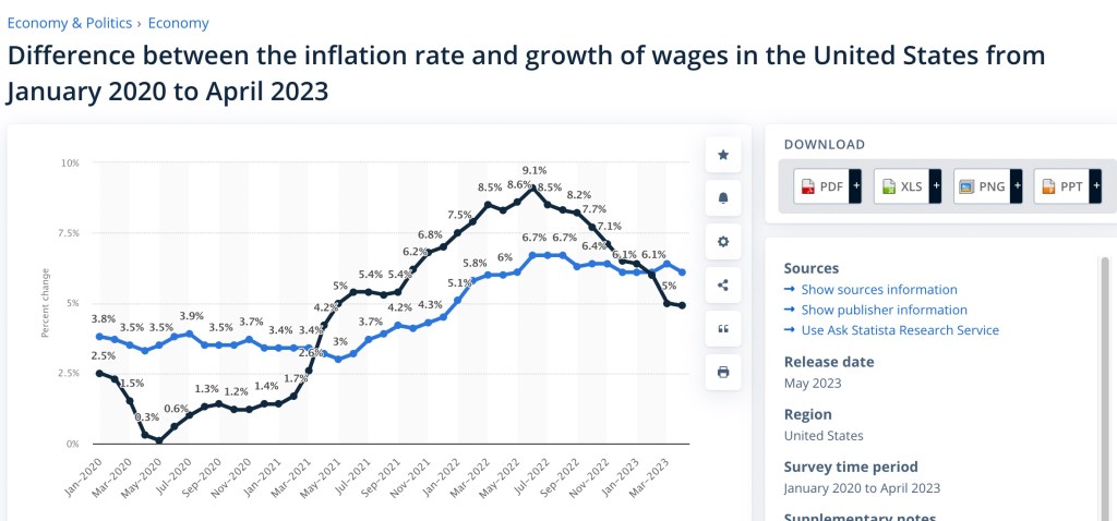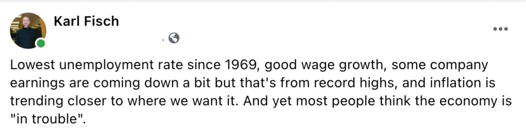 So, those of you who know me (either personally or virtually) know that I’m generally a pretty negative person (“the glass is not only half-empty, but it’s dirty around the rim”). Which makes me really question what is causing this current zeitgeist. I have many, many serious concerns around climate change, politics, and various other issues, but even to me it seems like the general consensus around financial matters is, to use a technical term, bonkers. Everyone’s individual circumstances, of course, are different, but I guess I would ask folks whose gut reaction is that “things are horrible” take a step back and try to find some perspective. Things undoubtedly are pretty bad for some folks (especially folks just entering the housing market), and if someone in your family has health issues or has recently been laid off, then all the statistics in the world won’t change your situation. But if that’s not you, perhaps pause a moment before telling a friend how horrible things are, or posting on social media, or commenting on an online financial literacy class :-). As the saying goes, you are entitled to your own opinions, but not to your own facts.