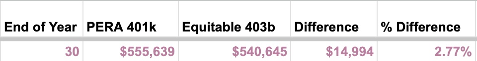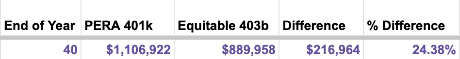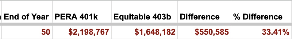 All of PERA’s investment choices are good and almost always have lower fees than the equivalent bidded Equitable choice. (Each white label fund is a mix of active and passive and generally has outperformed the indexes over time.) So, while the bidded Equitable 403b is good, PERA is better. Let’s break out the spreadsheet. Again, bidded Equitable does much better than most 403bs, but look at the differences over time. First, let’s look at choosing a target date fund (assuming a $500/month, $6,000/year contribution, and an assumed rate of return of 7%, you can adjust those numbers if you make a copy of the spreadsheet).