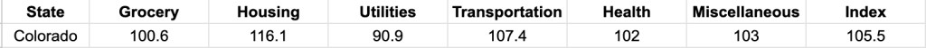 Here are the latest cost of living metrics by state (first quarter 2023). Colorado is the 18th highest state (out of 52, as it includes DC and Puerto Rico) with an index of 105.5 (100 is average). So, at first blush, Colorado is about 5% higher than “average” in the United States. So definitely our overall cost of living is “higher” than average, although I’m not sure I’d call being ranked 18th “so high.” But you also have to look at the individual categories that make up that index.