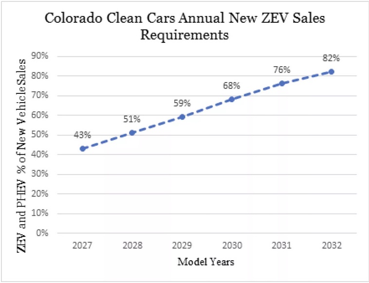I posted a while back suggesting that many Coloradans should consider purchasing an EV if they are in the market for a new vehicle. I thought I should do a follow-up post because Colorado has now approved a new rule requiring 82% of all new cars sold in 2032 have to be EV, full EV or PHEV (plug-in hybrid EV).