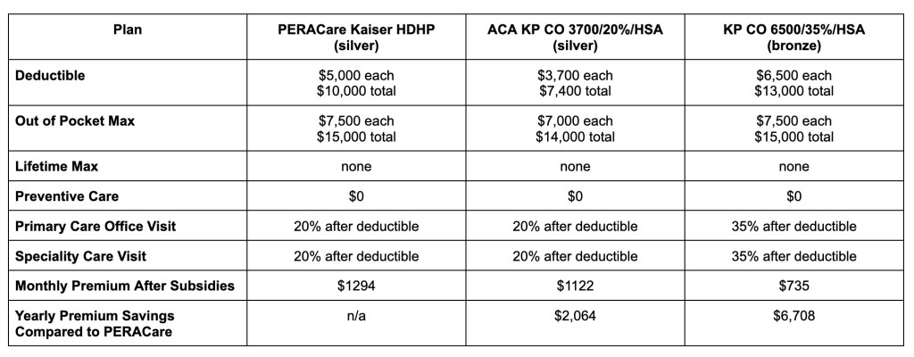We prefer the Kaiser HDHP plan, both because we have been very happy with Kaiser and because we want to be able to contribute to an HSA. The plan offered under PERACare is a “silver” level plan and is very similar to one of the silver plans offered on the ACA marketplace (with the marketplace silver arguably being slightly better). I’ve also included a bronze plan as that’s the one we’ve chosen for ourselves.