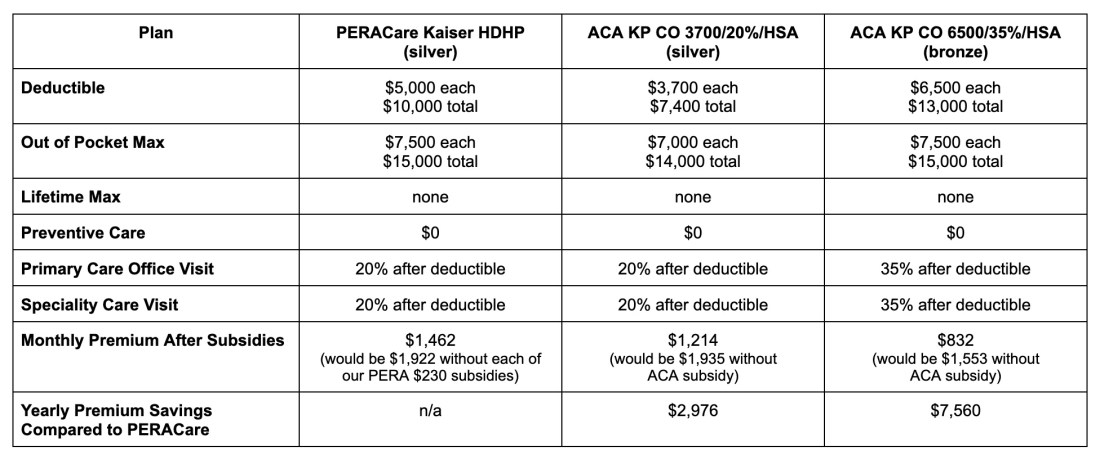 I've written previously about health insurance in retirement (and 2024 post) for members of Colorado PERA. As we are now in open enrollment for 2025, I thought I would update with 2025 numbers. But first, a little background. PERACare is health insurance that PERA retirees can get through PERA. It is guaranteed issuance (which was … Continue reading PERACare vs. ACA Marketplace: 2025 Edition