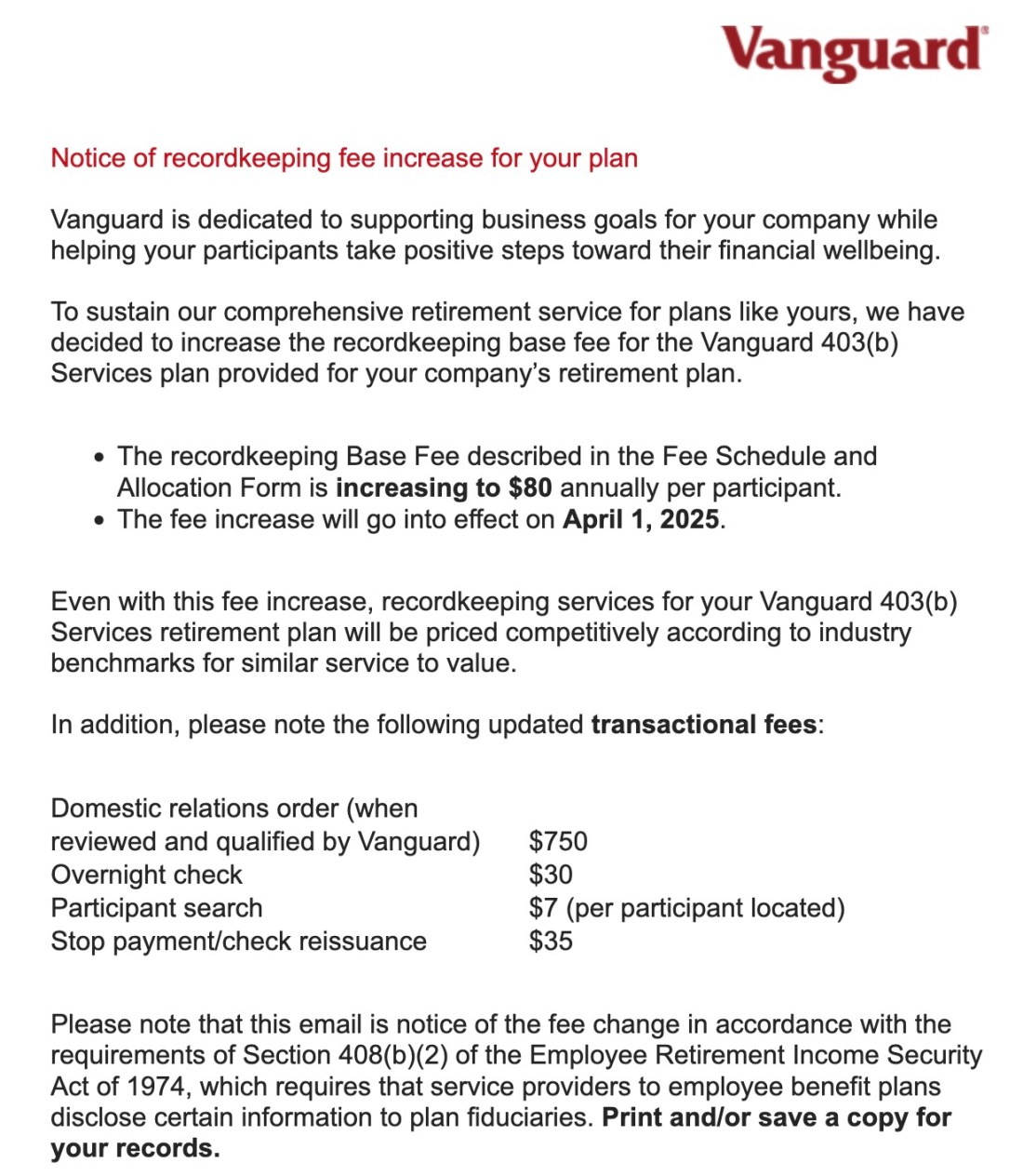 Vanguard Increasing 403b Administrative Fee to $80 a Year