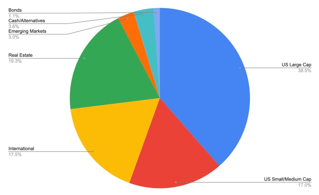 Note: These funds don’t all fit neatly into these three asset classes. For example, VTSAX includes small and mid-cap funds whereas PERA’s U.S. Large Cap is only Large Cap. And SLYV is only small-cap value, whereas PERA’s Small/Mid Cap is all small and mid caps. But I think it’s still helpful to group them this way.