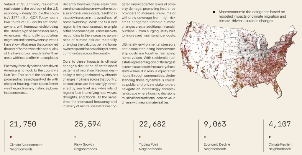 The linked report estimates that by 2055, 70,026 neighborhoods (84% of all census tracts) may experience some form of negative property value impacts from climate risk, totaling $1.47 trillion in net property value losses due to insurance pressures and shifting consumer demand.