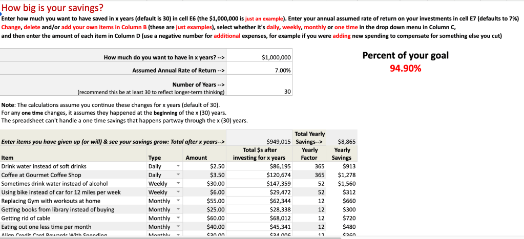 The first spreadsheet is a Growth of Savings Calculator (when you click on the link it will ask if you want to make a copy, click “Make a copy” to get an editable version). The basic idea is that you can go through your bank statements and/or credit card statements and identify some items that you are spending money on that don’t fully align with your values and goals, and that you could perhaps cut back on or give up altogether. It then allows you to enter those items, their cost, and the frequency that you pay for them, and the spreadsheet will not only calculate your yearly savings, but how much that will grow to if you invest those savings over time (with a default of 30 years). The spreadsheet has some sample items already listed, but you will want to modify some of them to match your situation, remove some of them altogether because they don’t apply to you and, crucially, add some of your own as these are just sample items and you presumably have items individual to you that aren’t currently listed.
