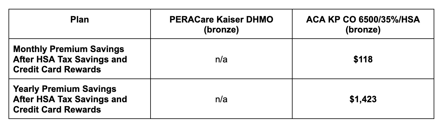 - The Credit Card Rewards Factor: If we choose PERACare the premiums automatically get deducted from our pension checks. While this is convenient it also means that we can’t use a credit card to pay them. With the marketplace plan we can use a credit card (with no surcharge). This means at a minimum we will get 2% cash back on our premiums (and possibly more if we use the premiums with new credit cards to get signup bonuses). Here’s a comparison of the two plans when you factor in both the tax savings from the HSA and the 2% cash back from paying with a credit card.