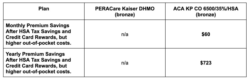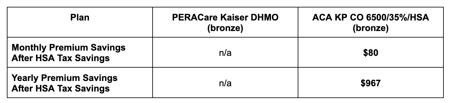 So here’s a comparison for 2026 of the new Kaiser Deductible HMO plan through PERACare and the current Kaiser HDHP Bronze Plan we have through the ACA Marketplace. The bolded items indicate the better plan on each metric.