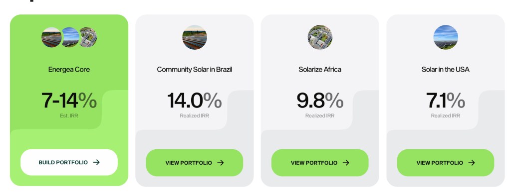 Energea owns a portfolio of renewable energy projects (mostly solar at this point, but at least one hydro project that’s for accredited investors only). They either build new projects or purchase and maintain/expand existing projects, and currently have energy project portfolios in the United States, Africa, and Brazil. (They are just ramping up projects in Latin America and that portfolio will likely become available in 2026.)