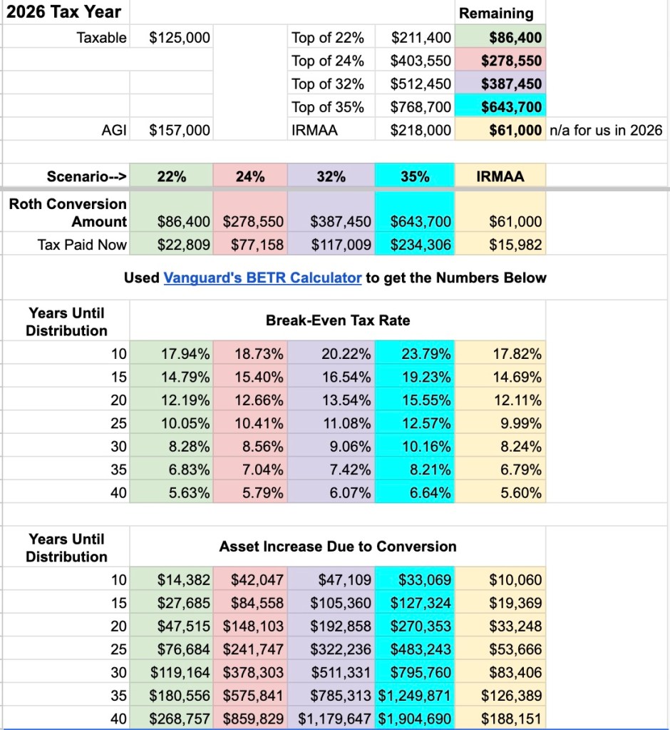 Because of the two-year lookback, people who anticipate enrolling in Medicare at age 65 have to be aware of possible IRMAA implications the year they turn 63. So for us, IRMAA is not a factor for us for 2026 (because we’ll only be 62), but will be something we’ll look at each year after that. Because of that, I’ve included a column for IRMAA on the spreadsheet to demonstrate how much lower of a conversion amount we would need to do if we wanted to stay below the first IRMAA threshold of $218,000. Instead of being able to convert $86,400 (the amount necessary to stay within the 22% tax bracket), or the much larger amounts that take us into the 24% and 32% tax brackets, if we wanted to avoid IRMAA the most we could convert is $61,000 (still a good amount, but much lower). We will see what it looks like with next year’s numbers, but I suspect the impact of IRMAA will be small enough that we won’t let that limit us. (For example, for 2026 the additional ~$1,148 x two of us in Medicare premiums for the first tier of IRMAA would effectively increase a federal 22% marginal tax on the conversion to only 24.6%.)