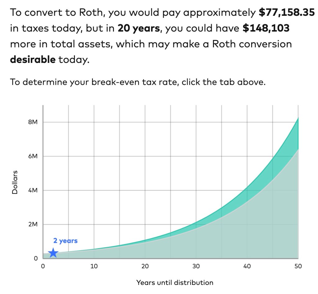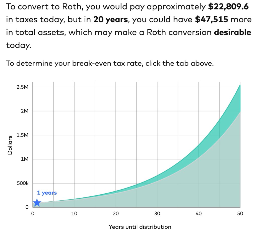 The further you move down that list, the more likely a Roth conversion makes sense, because the less tax efficient the money you are using to pay the taxes with now is the lower the total lifetime taxes you will pay. Sometimes (but not all of the time) that means even if you aren’t in a higher tax bracket when you distribute the money it can still make sense to do a Roth Conversion. Read the report if you want all the details (and more specifics on the math), but we’re just going to proceed with that in mind. Conveniently, Vanguard provides a free online calculator so you don’t have to do the math yourself. The data I’m going to share below comes from this calculator.