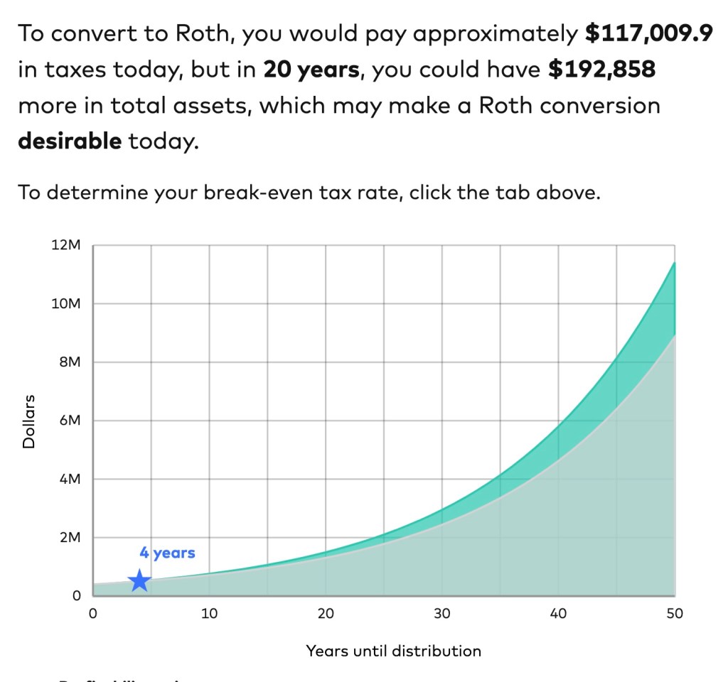 What if we went past 35% into the 37% bracket? Well, I’m not going to do that (although you could) due to a practical limitation for us: how much we have in cash and cash equivalents available to pay the taxes now. We don’t have enough to pay the taxes now at these really large conversion amounts without dipping into our taxable investments (not just cash and cash equivalents), which would then change the calculator inputs. You definitely could do the work to figure this out, but the calculator doesn’t get granular enough to make that easy and we aren’t going to make that big of a conversion.