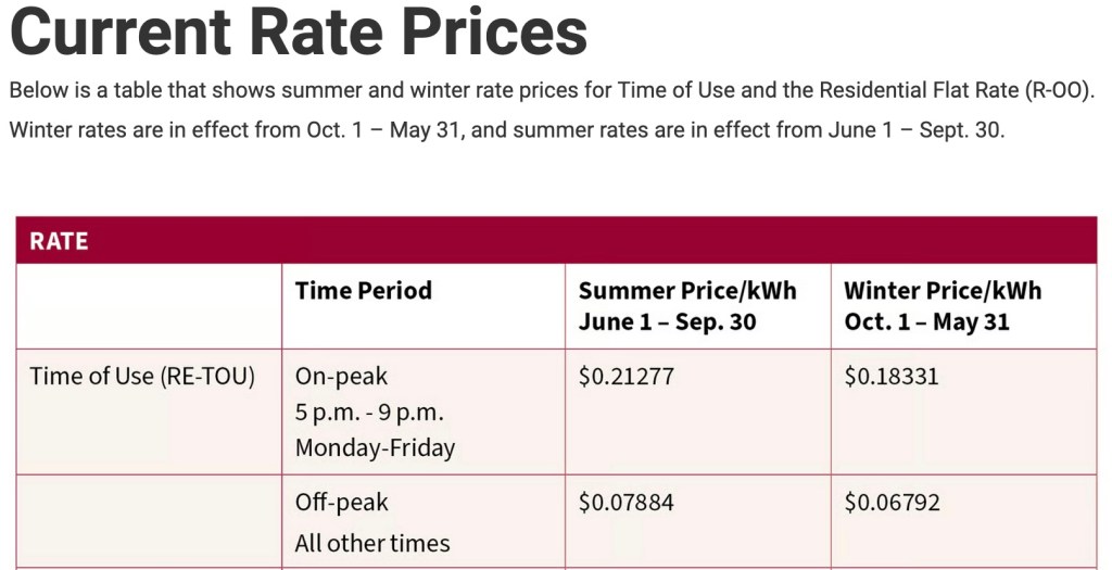 - We have time of use pricing for electricity. We always charge our car during off-peak pricing (between 9 pm and 5 pm), so we always get the lowest charging rates. In the podcast I mentioned $0.068 per kWh, which is the “winter” price (October – May). It’s a bit more in the summer (June – September), $0.07884. So the average yearly rate is actually $0.07156*, so I’ll use that number below.