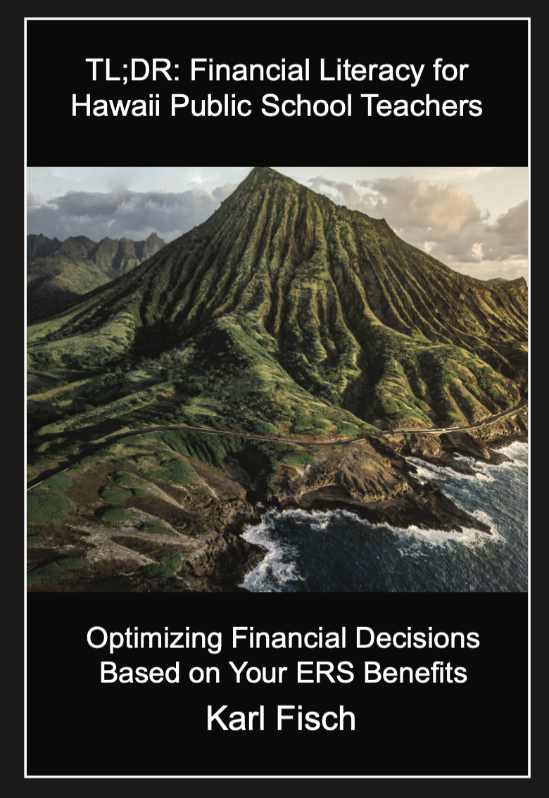 I just wanted to share my latest book, this one for teachers in Hawaii Public Schools, focusing on financial literacy and making the most of their ERS pension benefits. Please consider sharing with any educators you know in Hawaii. This is the latest in the TL;DR Financial Literacy series. If you know educators in the … Continue reading TL;DR: Financial Literacy for Hawaii Public School Teachers: Optimizing Financial Decisions Based on Your ERS Benefits